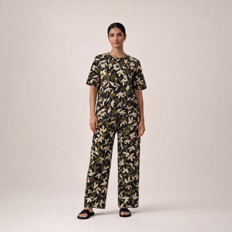 Women’s Olive Leaf Print Two-Piece Set – Top & Pants