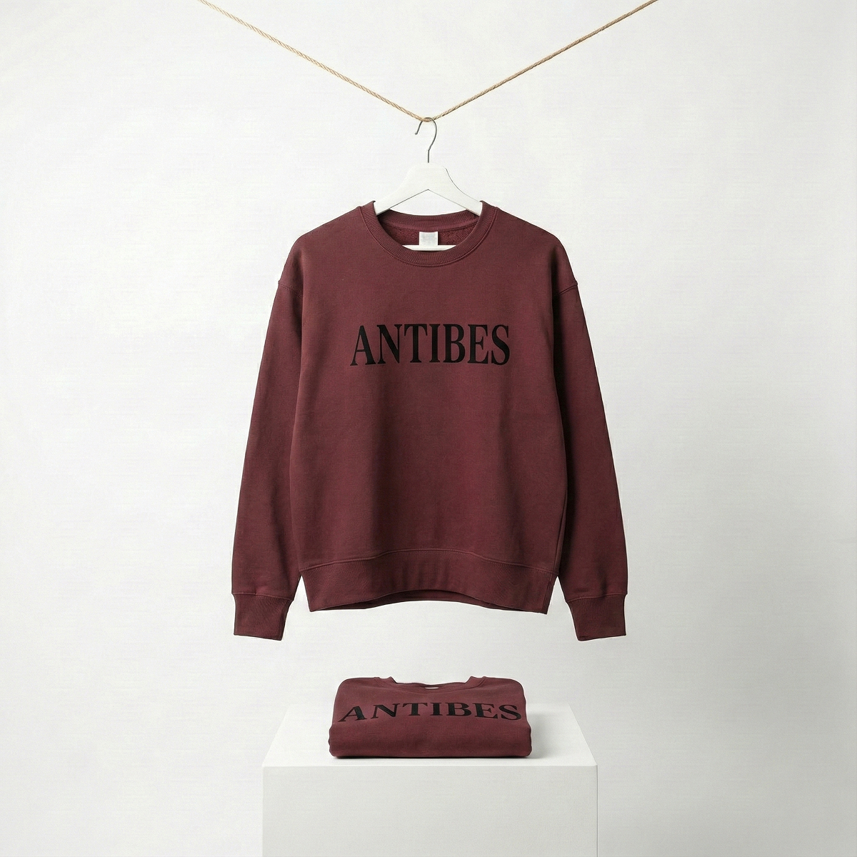 Maroon Crewneck Sweatshirt with Black “Antibes” Print | Premium Cotton Casual Wear