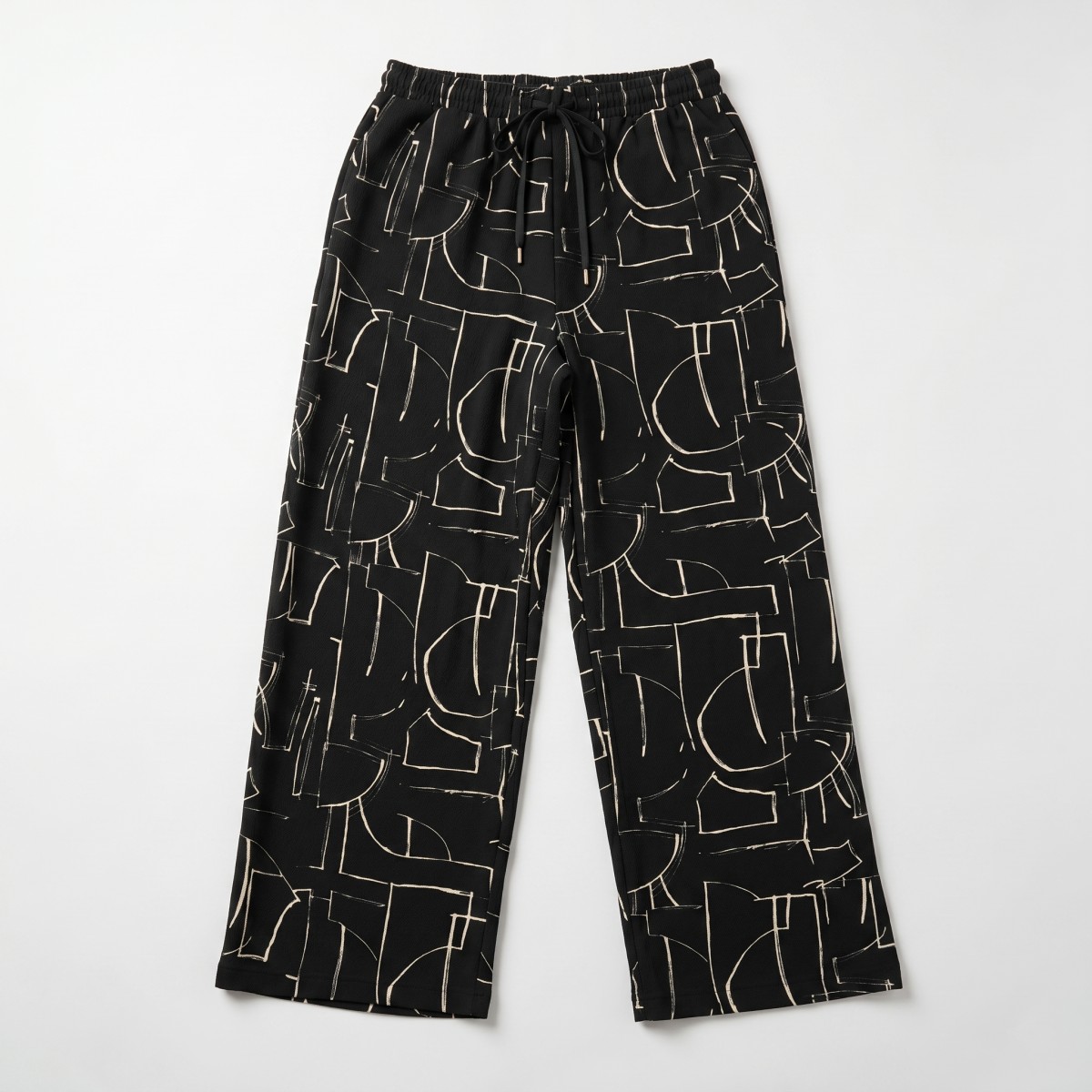 High-quality product image showing the black abstract two-piece lounge set for women. Includes front view of wide-leg bottoms with elastic waistband and matching short-sleeve top featuring abstract print. Ideal for online shopping showcase.