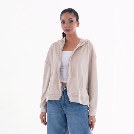 Women’s Premium Beige Velour Zip-Up Hoodie